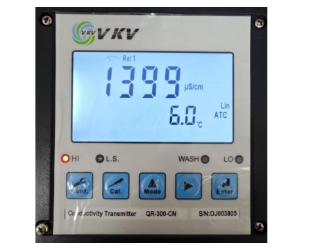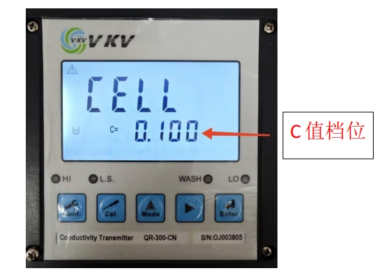 5. 根據(jù)電極線標(biāo)號(hào) C 的數(shù)值選擇與之最接近的檔位電導(dǎo)預(yù)設(shè)值:0.0100、0.100、0.500、10.00(例如電極標(biāo)號(hào)數(shù)值 C=0.3188,則選擇C=0.500 檔位)通過(guò)▲ 或 ? 鍵來(lái)變更檔位。